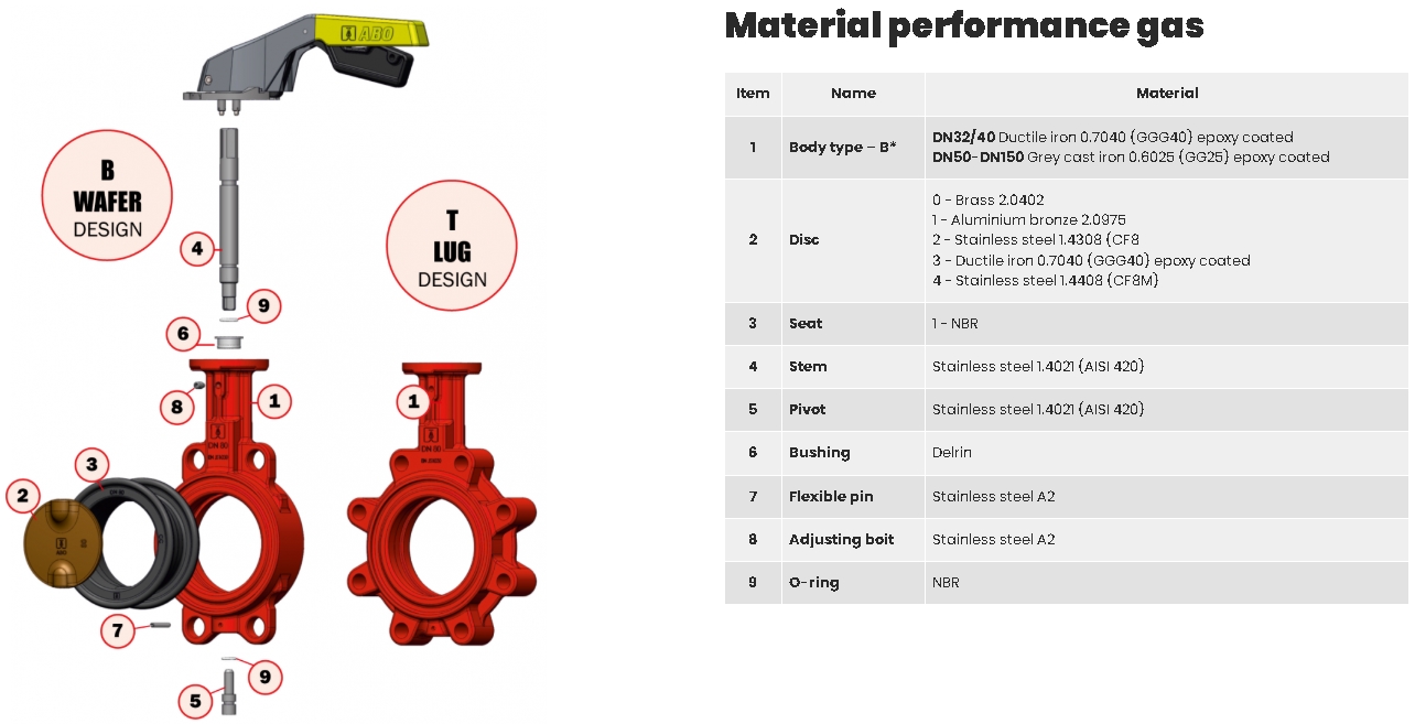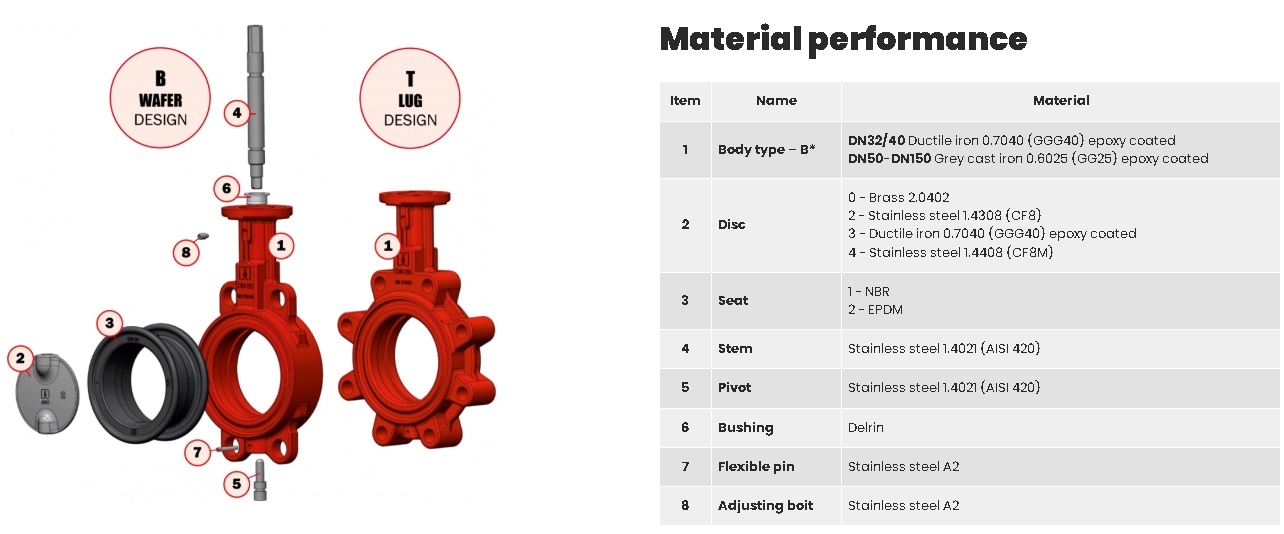 - Корпус «B» (ПЛАСТИНА): *) Корпус «T» (ПРОУШКА): DN32/40-DN150 Ковкий чугун 0.7040 (GGG40) с эпоксидным покрытием